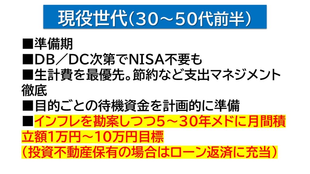 また、30代ごろまではスキルを高めるための自分投資が大切です。結婚準備に向けた資金、自動車などを買うための頭金などライフイベント発生に向けた資金ニーズも積み上がります。住宅購入だったり、子供がいるなら将来の学資だったり、目的に応じた待機資金を確実に確保していくことを考えてください。