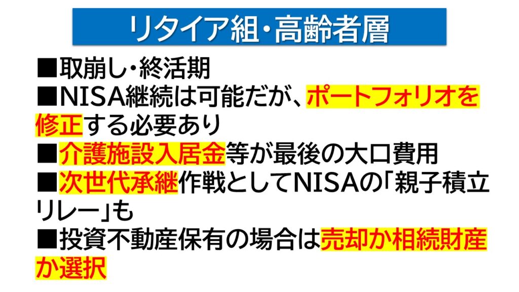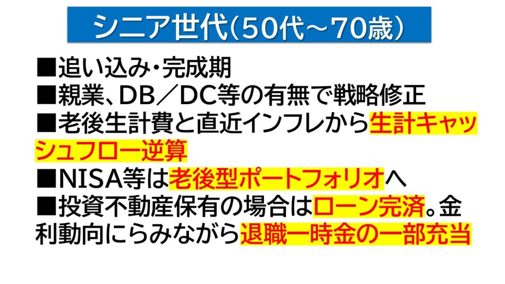 定年が近づいた世代、あるいは第一次定年を過ぎて老後への端境期に差し掛かる世代です。資産形成はゴールに到達しないといけないステージですが、就労環境も生活設計も個々違います。そして最大の違いは「価値観」です。拙著「幸福寿命を延ばすマネーの新常識」(日本経済新聞出版刊)で詳しく説いていますが、1000万円あれば十分なのに2000万円を作る必要はありません。ポートフォリオは自分の条件に合わせて精査する必要があります。
