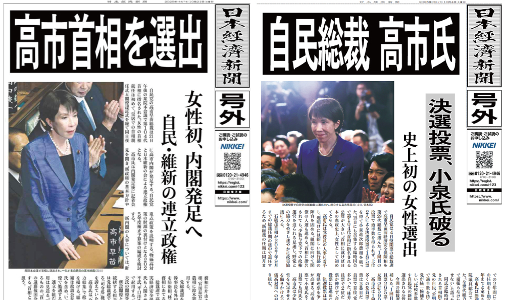 憲政史上初の女性宰相、高市早苗首相が誕生しました。国政トップという切り口では奈良時代の称徳天皇以来約1255年ぶりになりましょうか。同じ奈良つながりが偶然にしては出来過ぎのストーリーのようにみえます。日本経済新聞でも総裁・首相のW号外で対応、ニュース性の大きさをうかがわせました。