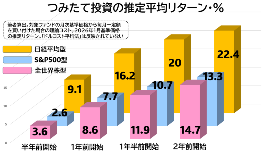 グラフは2024年1月(2年前)の新NISAスタート時から積立投資を始めた場合から、2025年7月(半年前)に開始したケースまで、4区分に分けてそれぞれの概算リターンを推計したものです。 買付の回数、タイミングなどは個々バラバラなのでご自身の成果とは異なるとは思いますが、いかがでしょう。何かお気づきになったところはありましたか?
