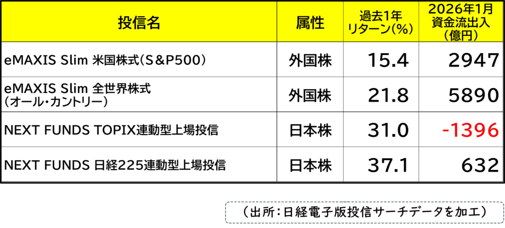 にもかかわらず! 2026年に入ってもまだ外国株投信の資金流入が大幅に上回っているのです。全世界株型は日経225型のじつに9倍超。どうなっているのやら……。