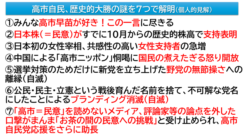 さて、それにしても今回の圧勝劇、その理由や背景についてはみなさんどう考えますか?
