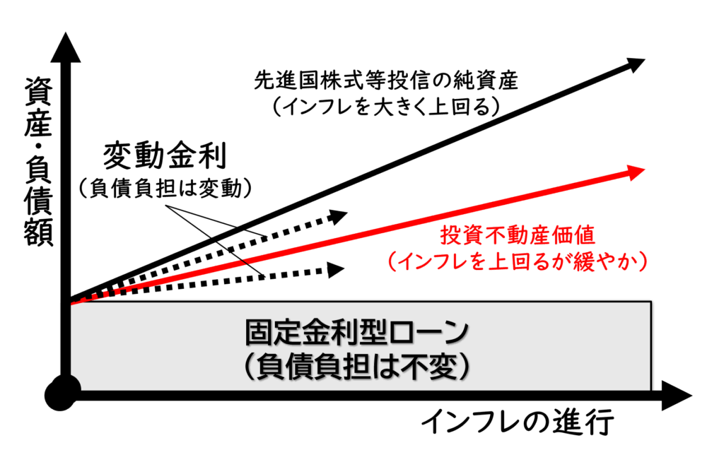 図はインフレの進行によって資産価値もしくは負債負担がどう変化するかを模式化してみました。このときインフレに伴い、投資不動産の価値は緩やかにあがっていきます。家賃が上がらないとキャッシュフローにはメリットはありませんが、少なくとも地価を押し上げることには間違いありません。