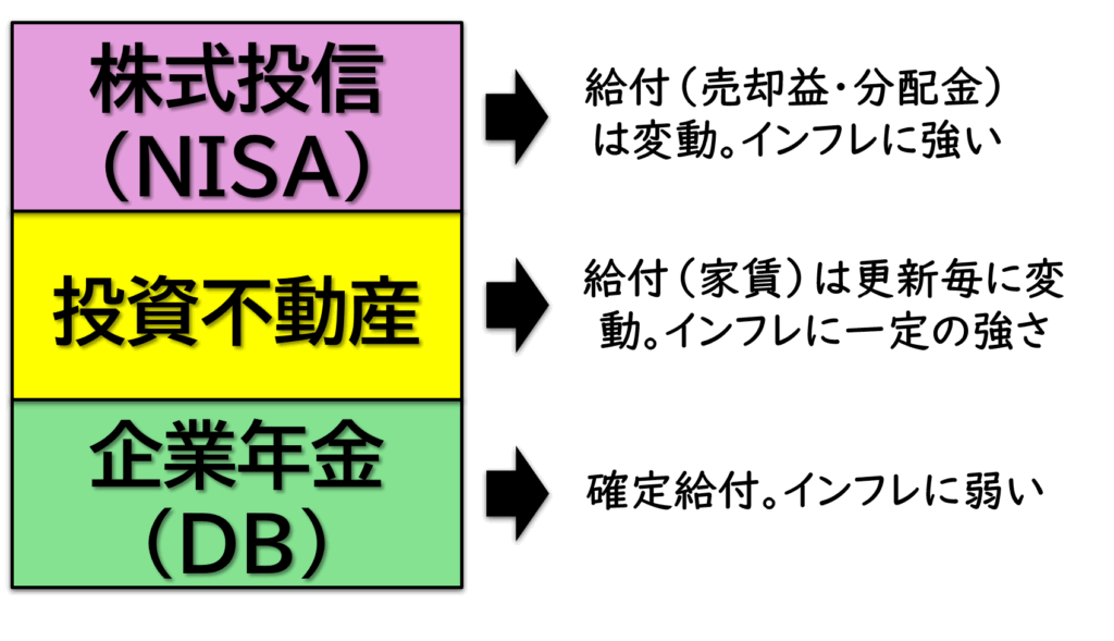 投資不動産の給付は家賃ですが、地価も含めて緩やかに上がり、インフレに一定の対抗力が生じます(デフレにも強いという利点も)。株式投信は先進国株式に限りますが、先ほど説明したように基本的にインフレに強いし負けない商品です。このように企業年金は安心さがある半面、インフレに対する脆弱さがあります。将来の資産はインフレに強い株式や不動産もあわせて保有しておきたいところです。